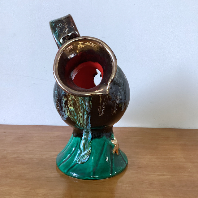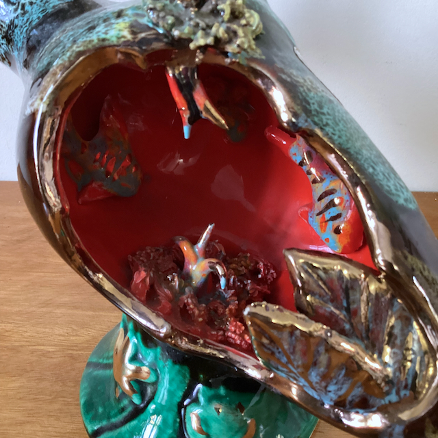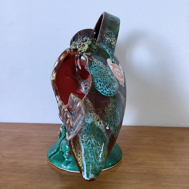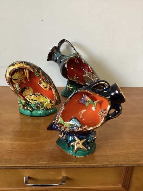 Amphore Vallauris verte, en céramique émaillée : des poissons colorés et dorés, des coraux habitent à l’intérieur !
