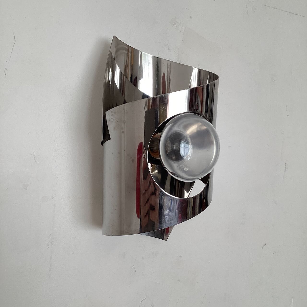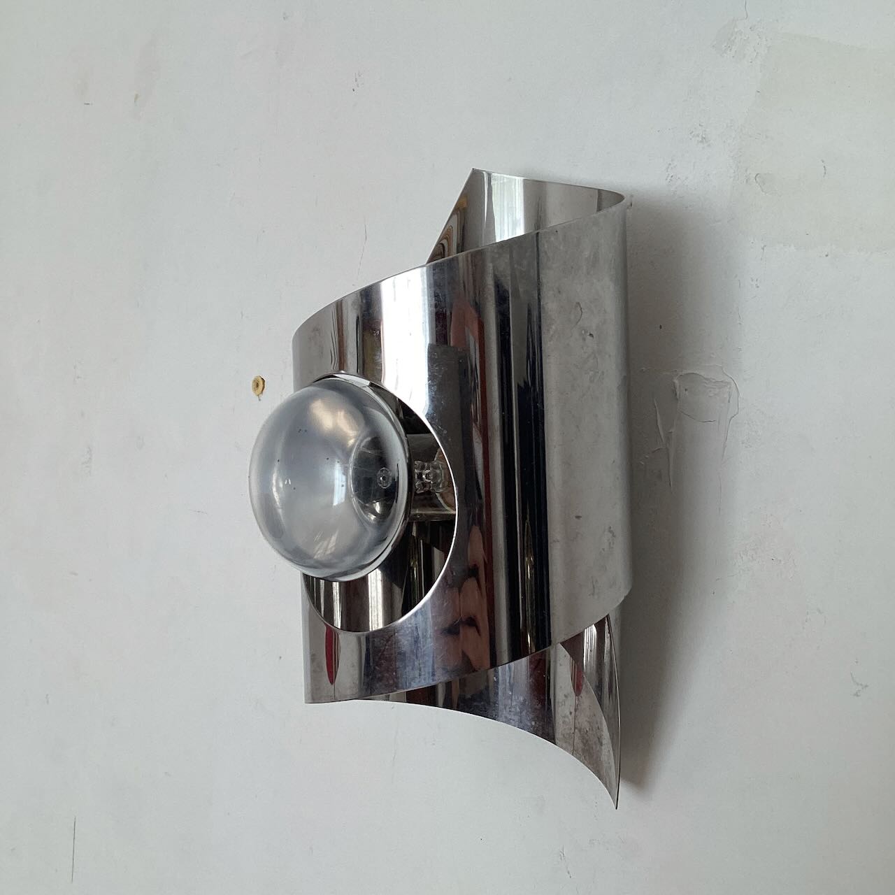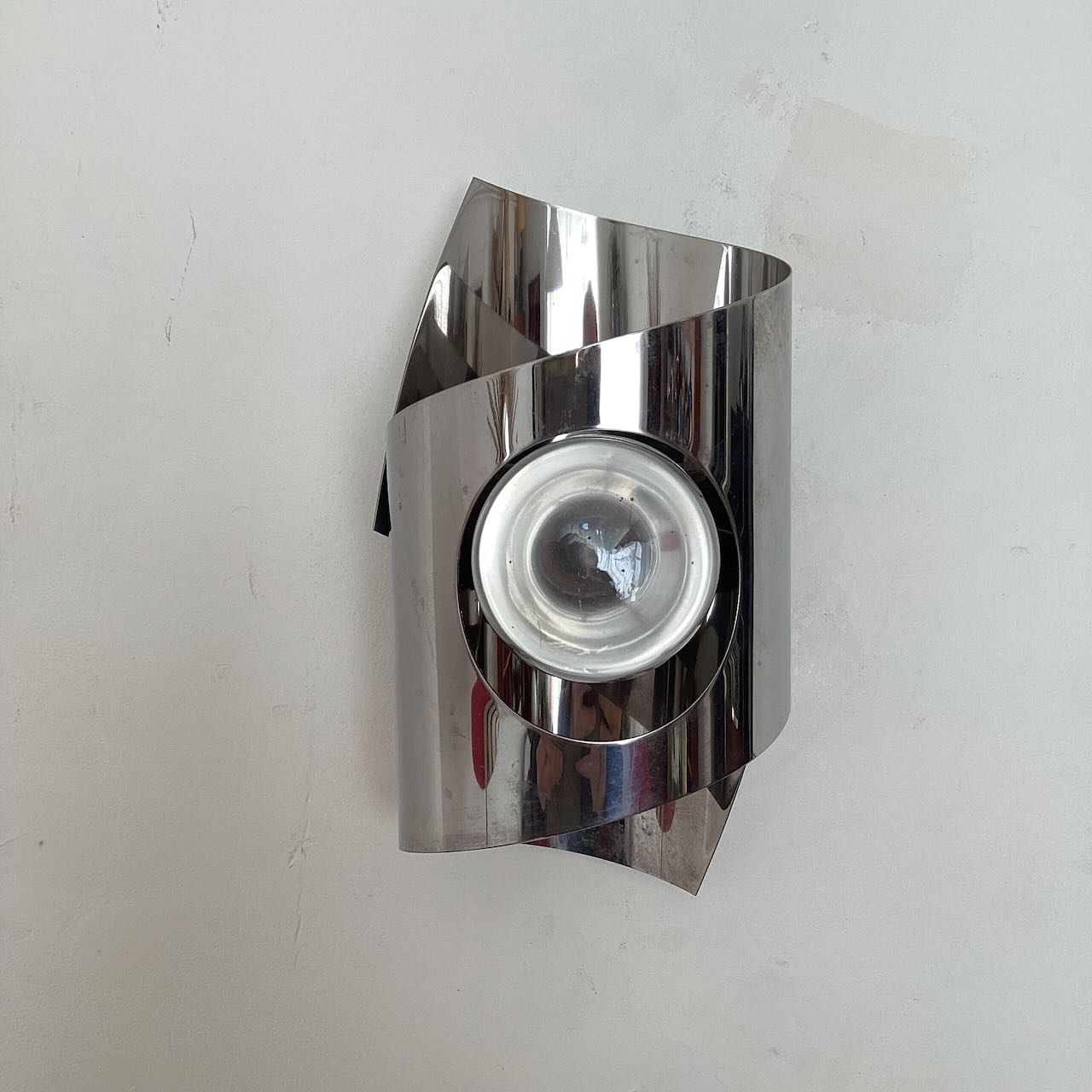 Applique chromée années 70, en métal inoxydable chromé. Un ruban de métal s’enroule autour de l’ampoule.