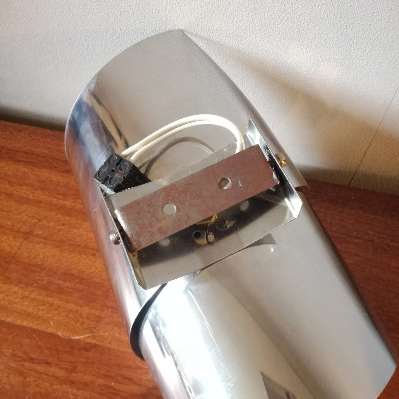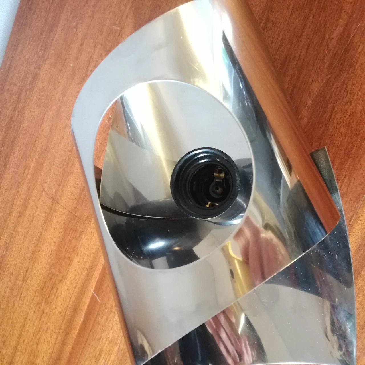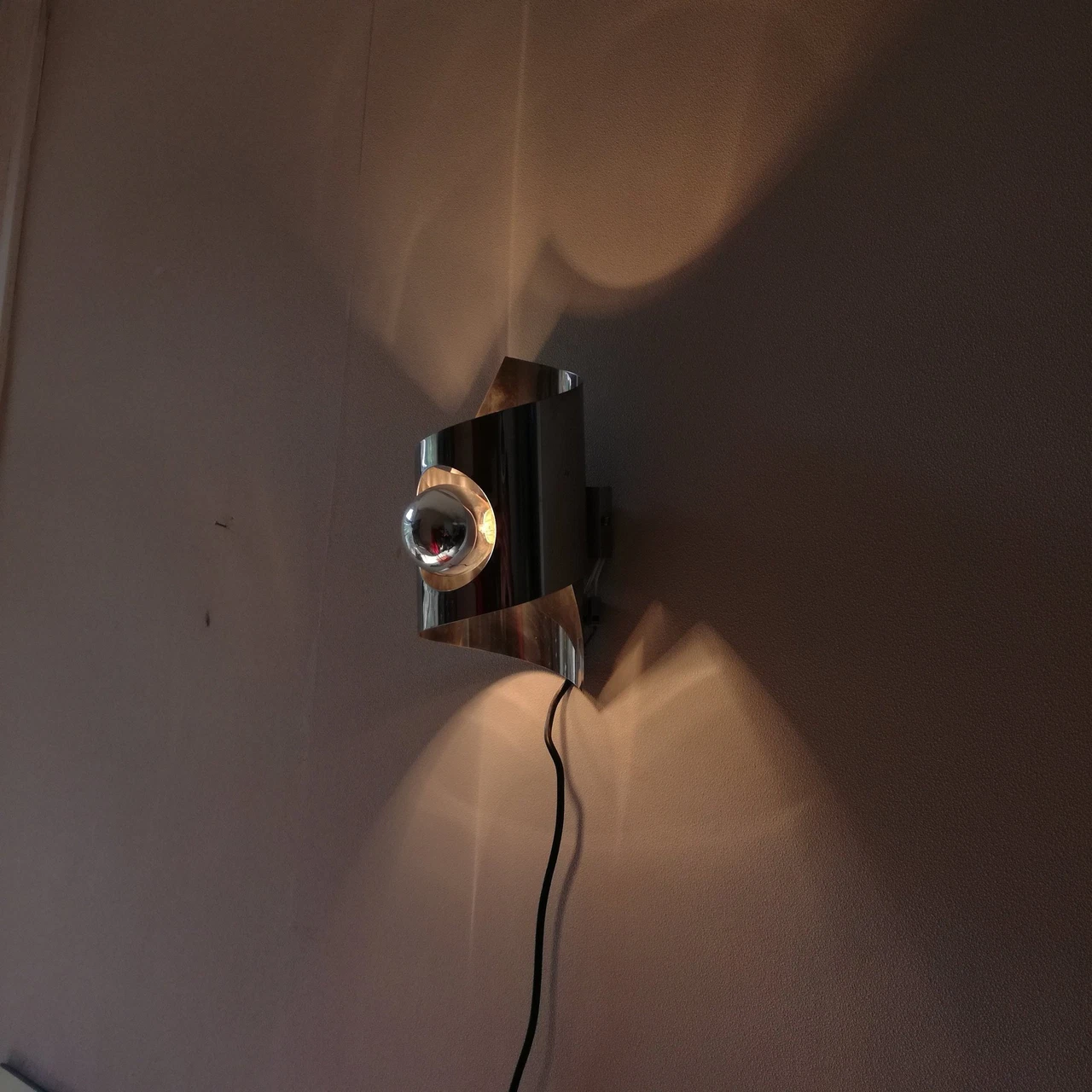 Applique chromée années 70, en métal inoxydable chromé. Un ruban de métal s’enroule autour de l’ampoule.