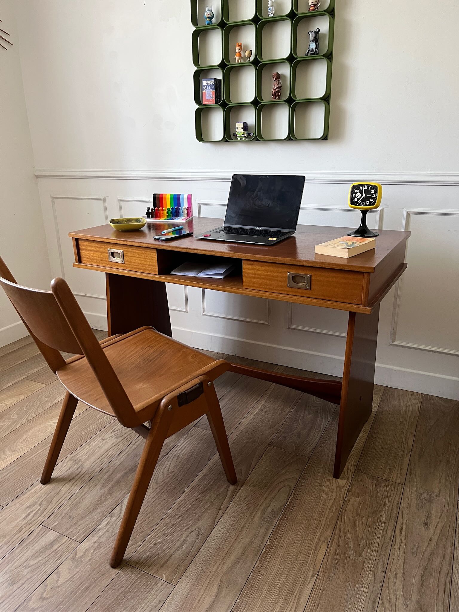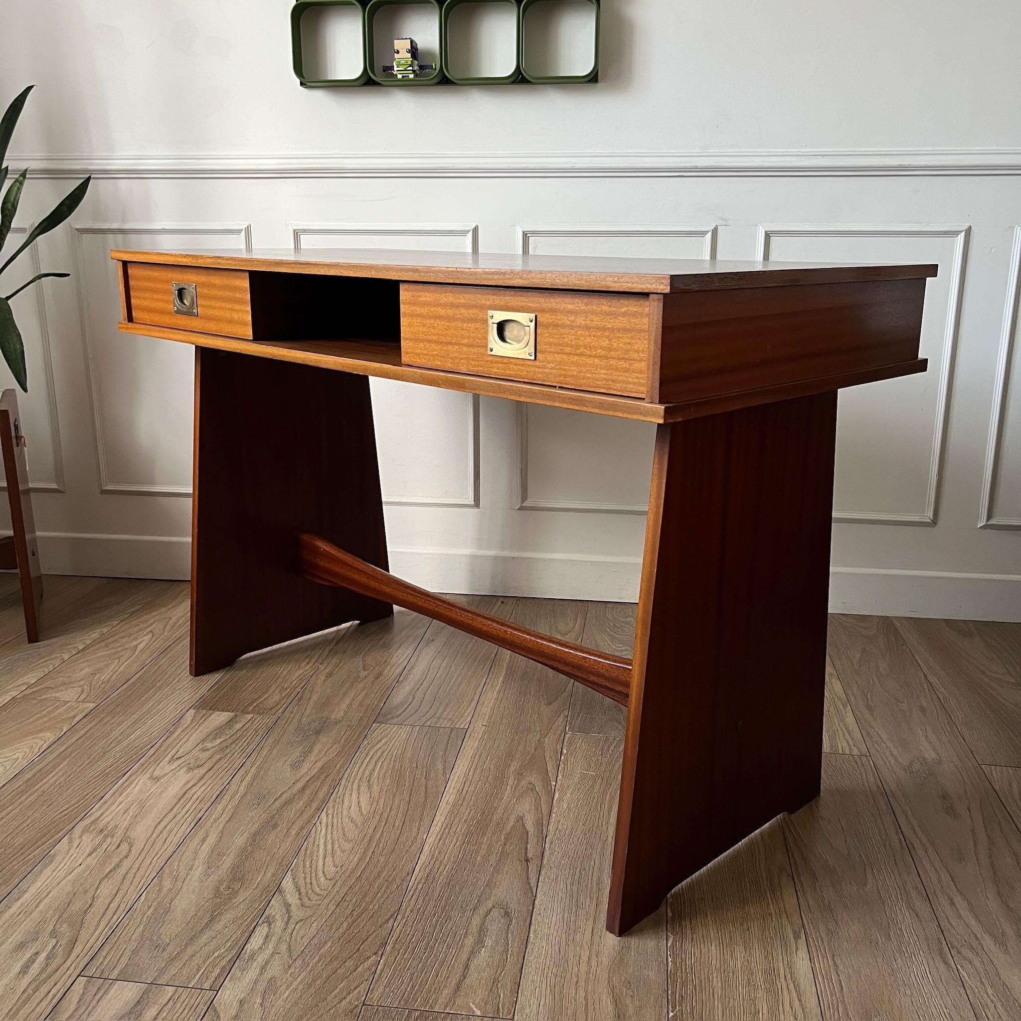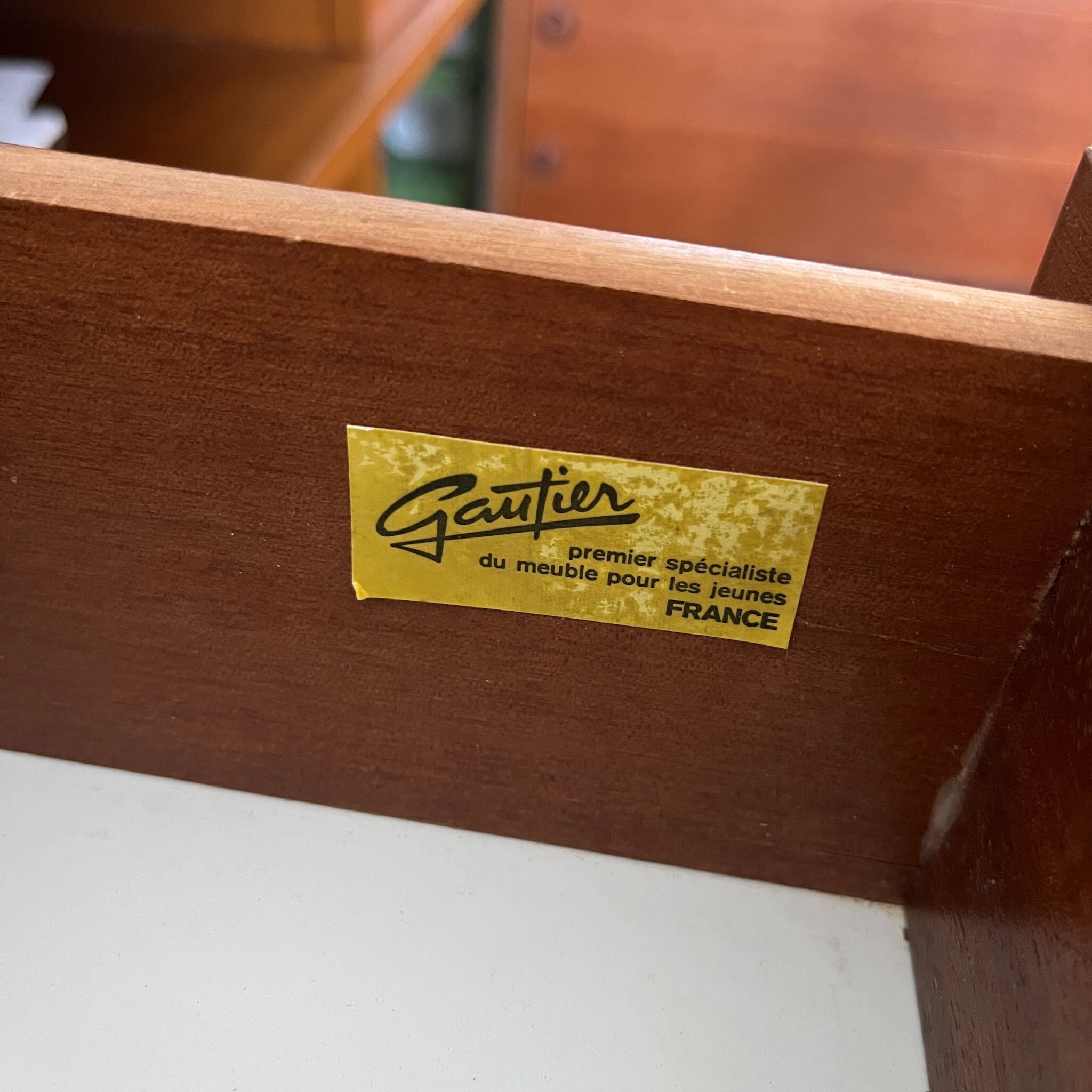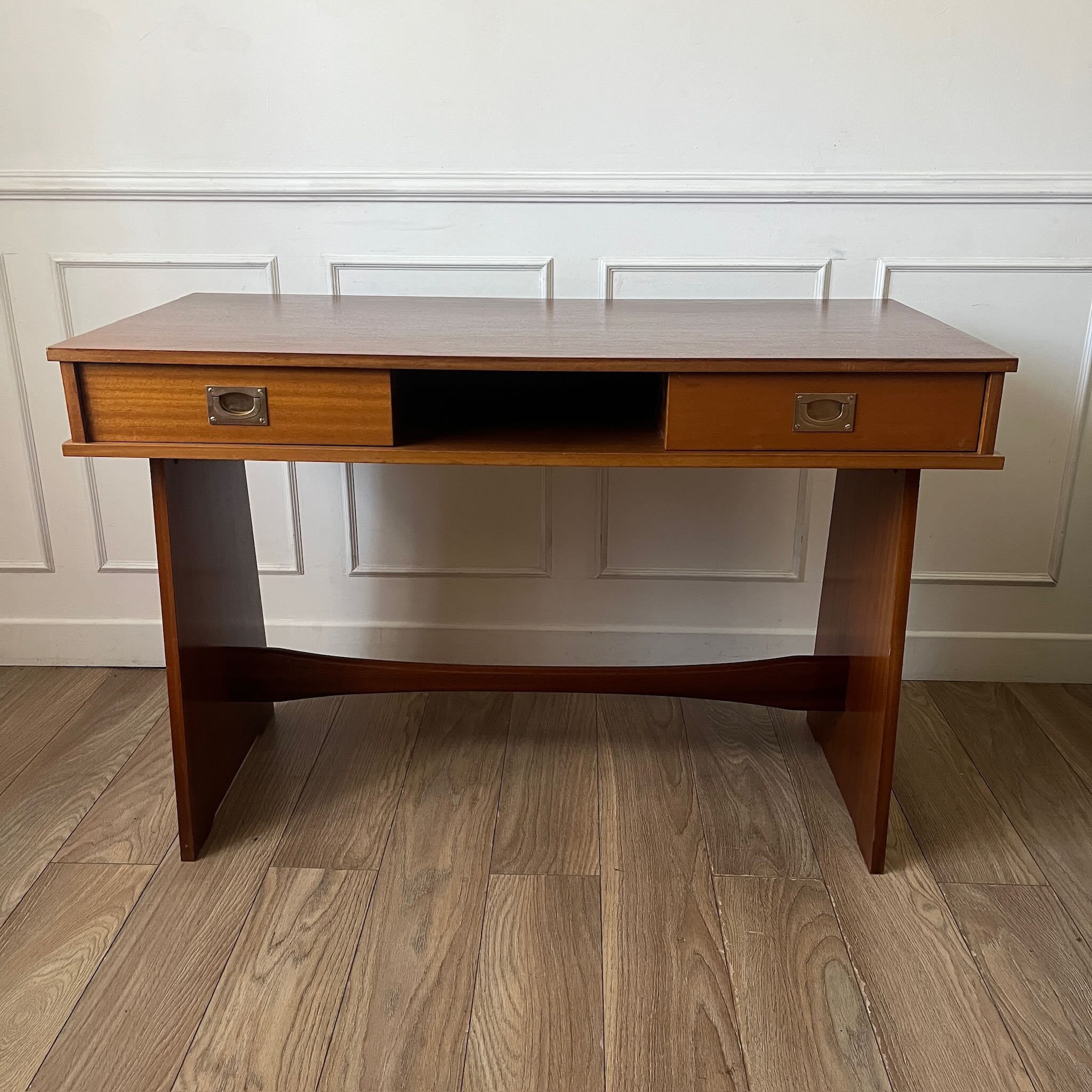 Bureau des années 70, placage teck, de marque française Gautier. Le bureau possède deux tiroirs et une niche frontale. Belles poignées de tiroir en laiton. Doté de lignes épurées et d’un design sobre et élégant, ce bureau convient à tous les espaces aussi bien dans une chambre d’enfant ou ado, que dans un salon ou pour un coin télétravail.