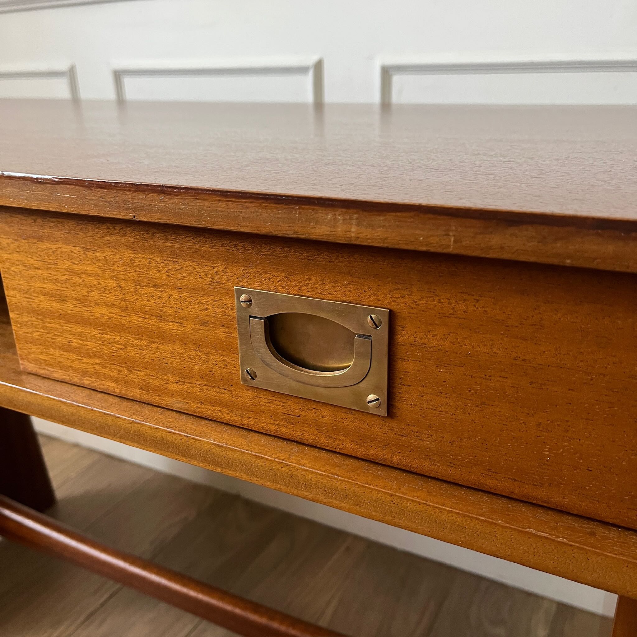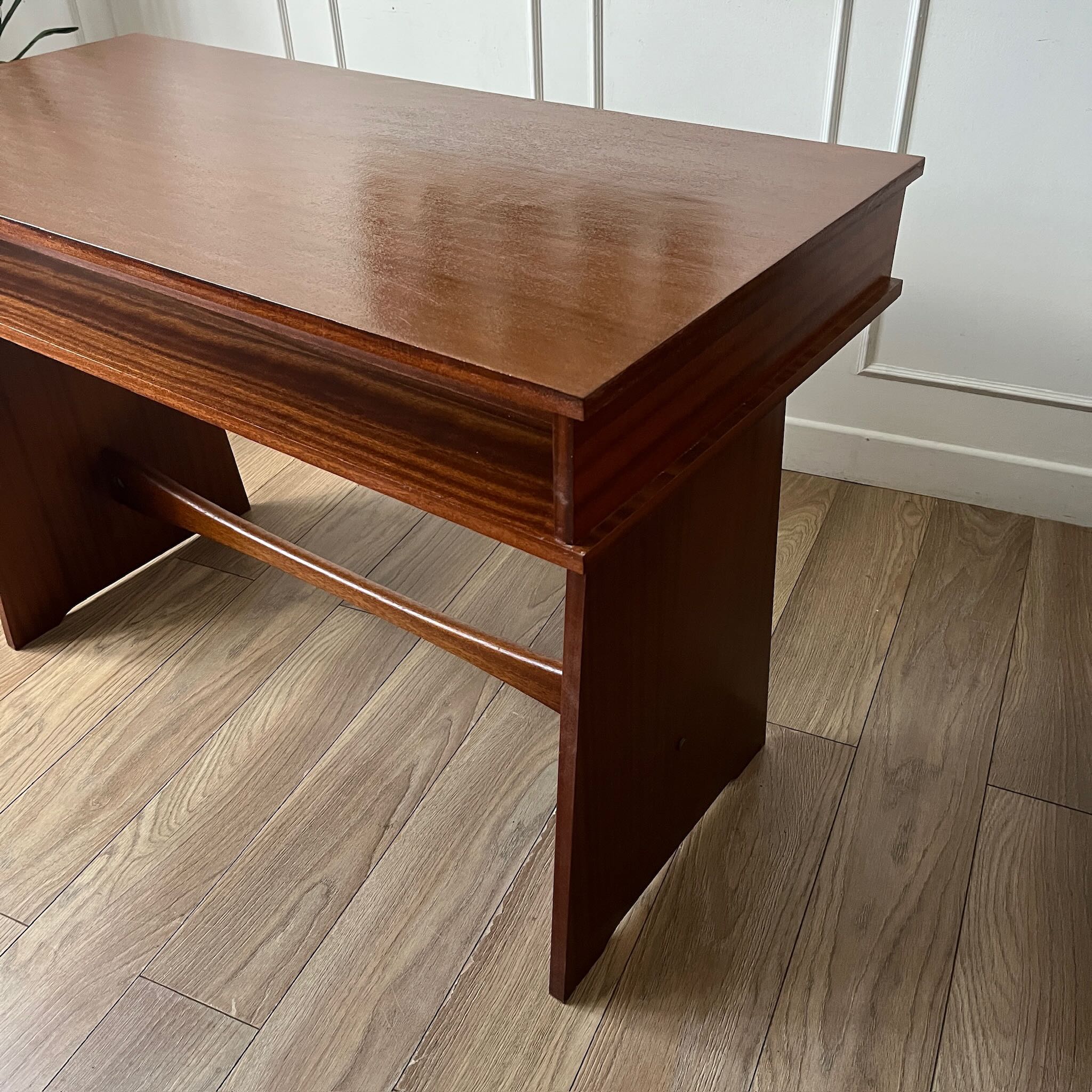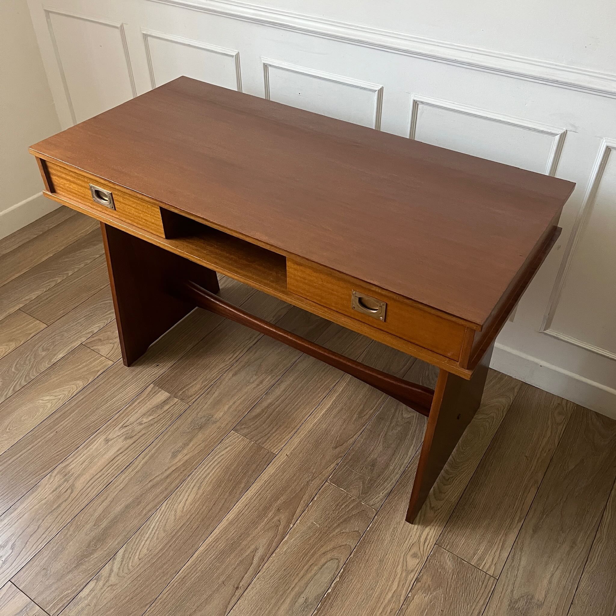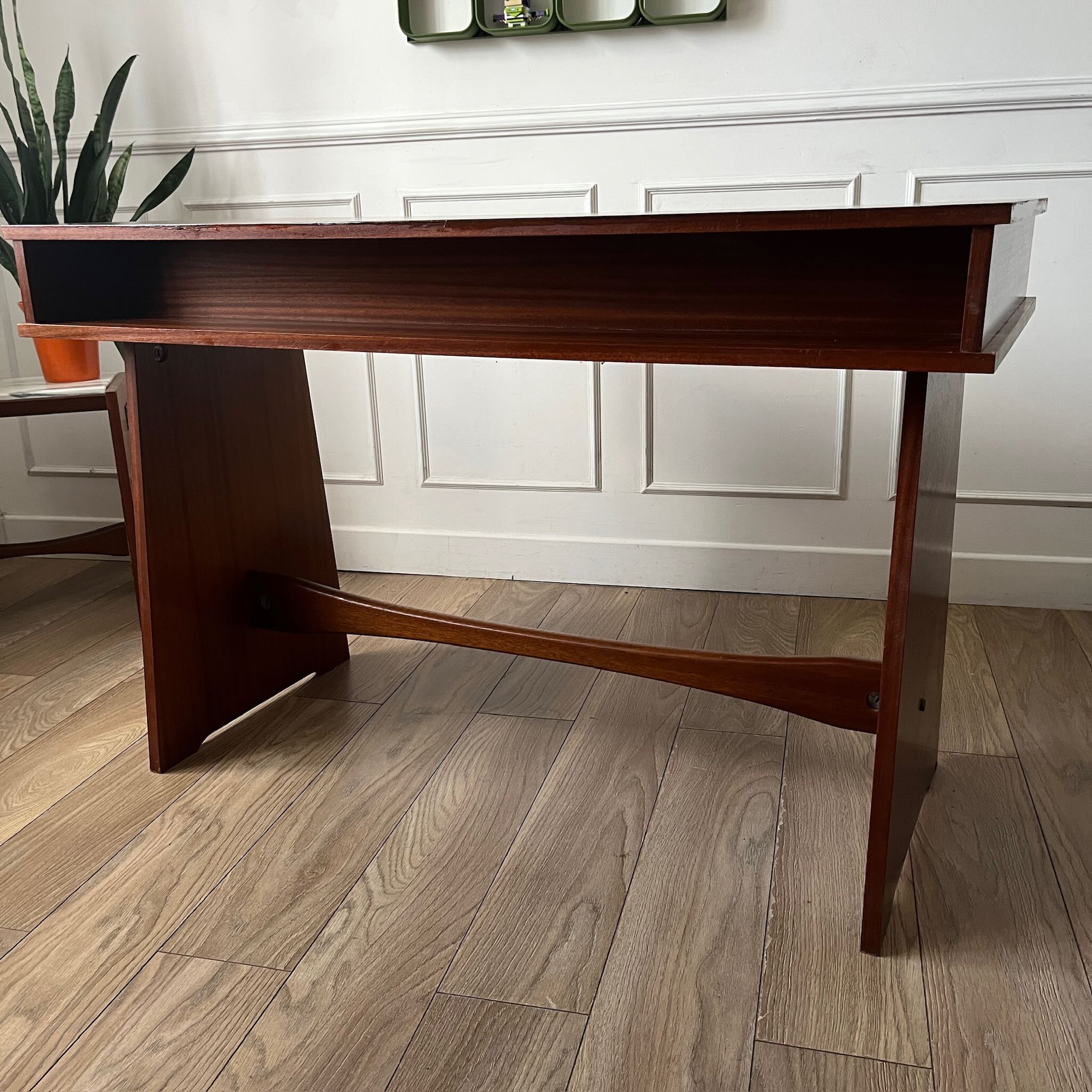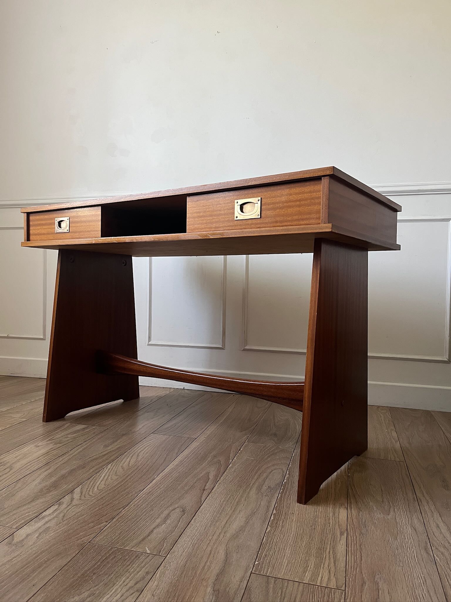 Bureau des années 70, placage teck, de marque française Gautier. Le bureau possède deux tiroirs et une niche frontale. Belles poignées de tiroir en laiton. Doté de lignes épurées et d’un design sobre et élégant, ce bureau convient à tous les espaces aussi bien dans une chambre d’enfant ou ado, que dans un salon ou pour un coin télétravail.