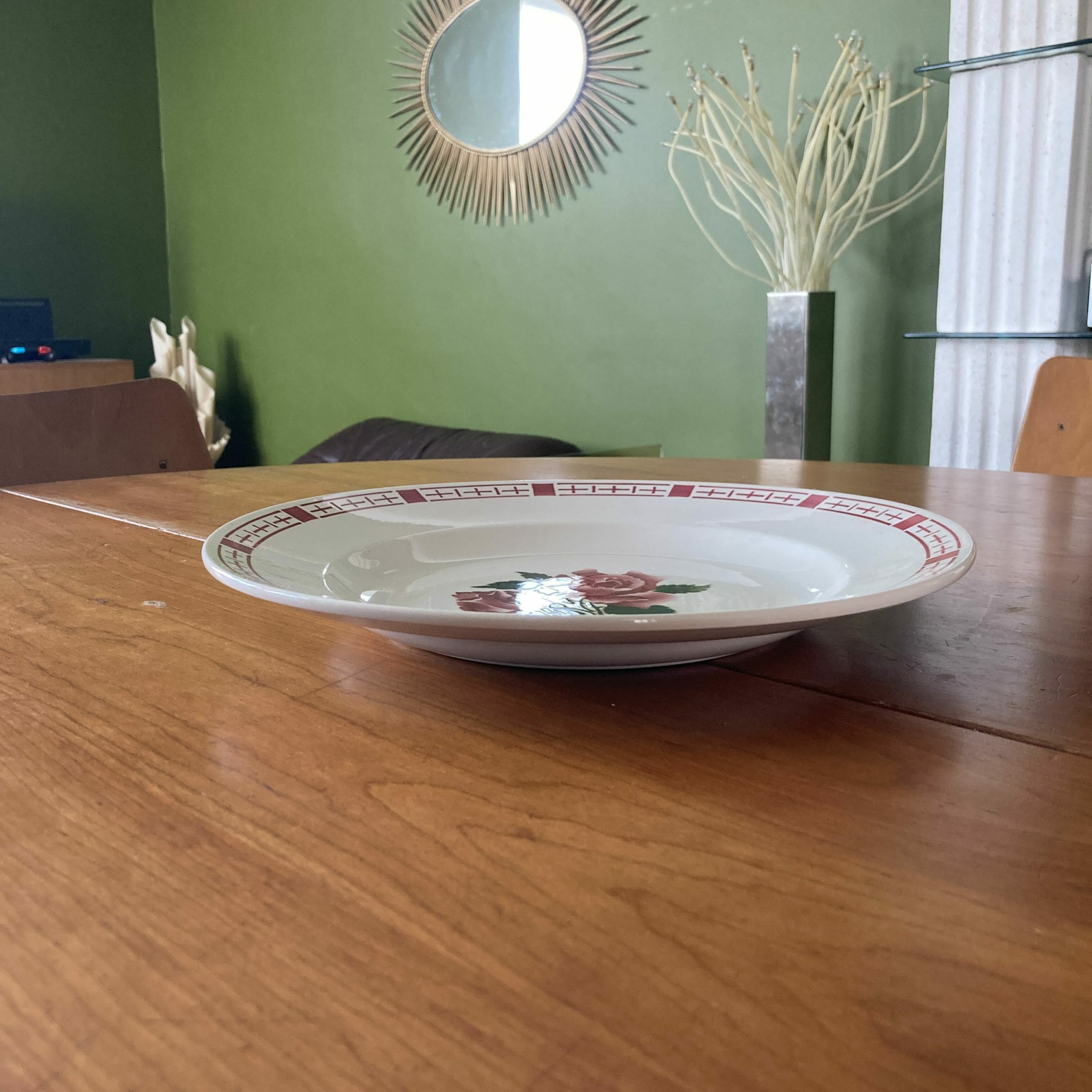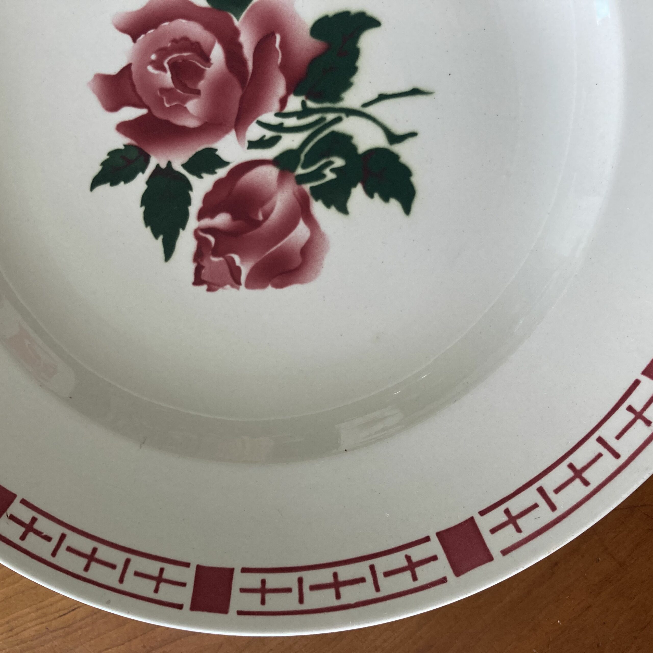 Plat creux ancien Digoin Sarreguemines, modèle Saverne, dans les tons de rose. Roses au centre et tour avec des motifs décoratifs géométriques.