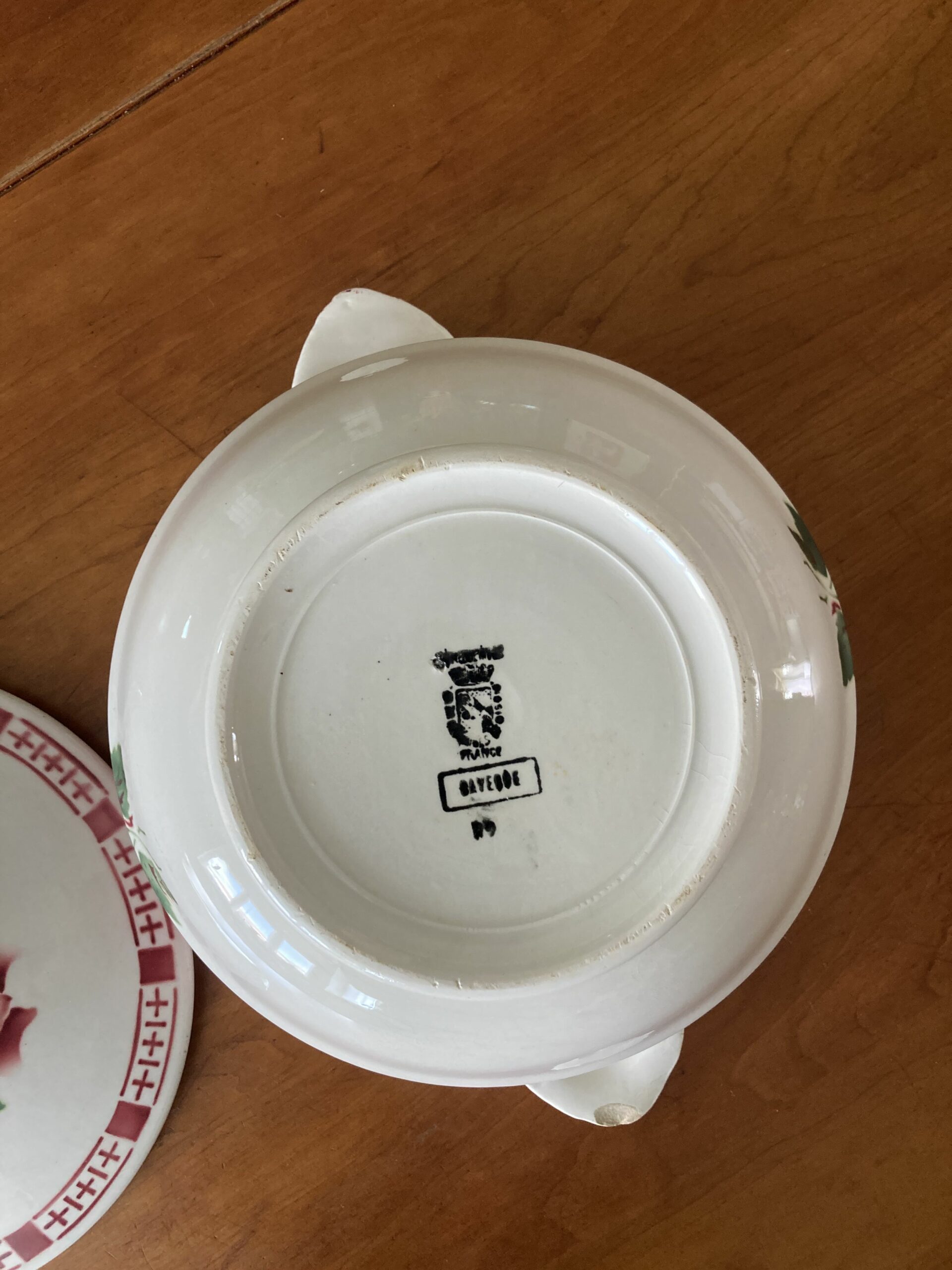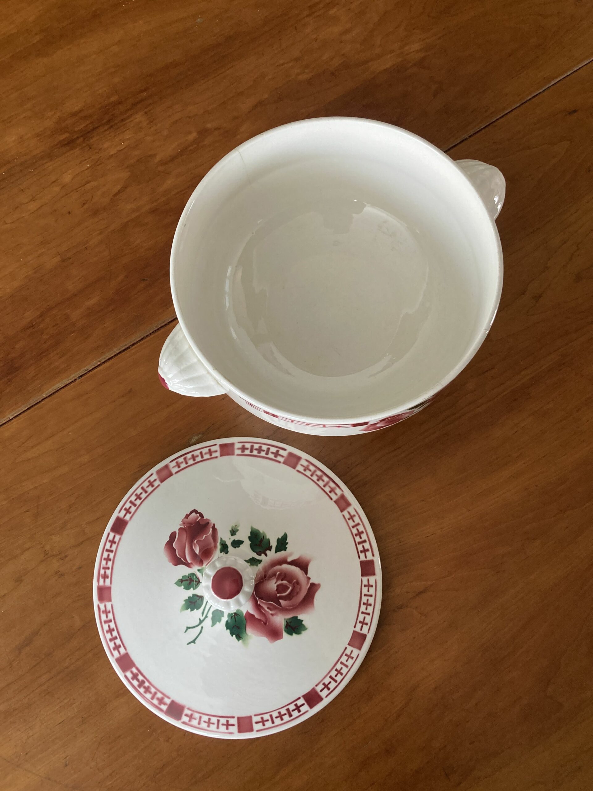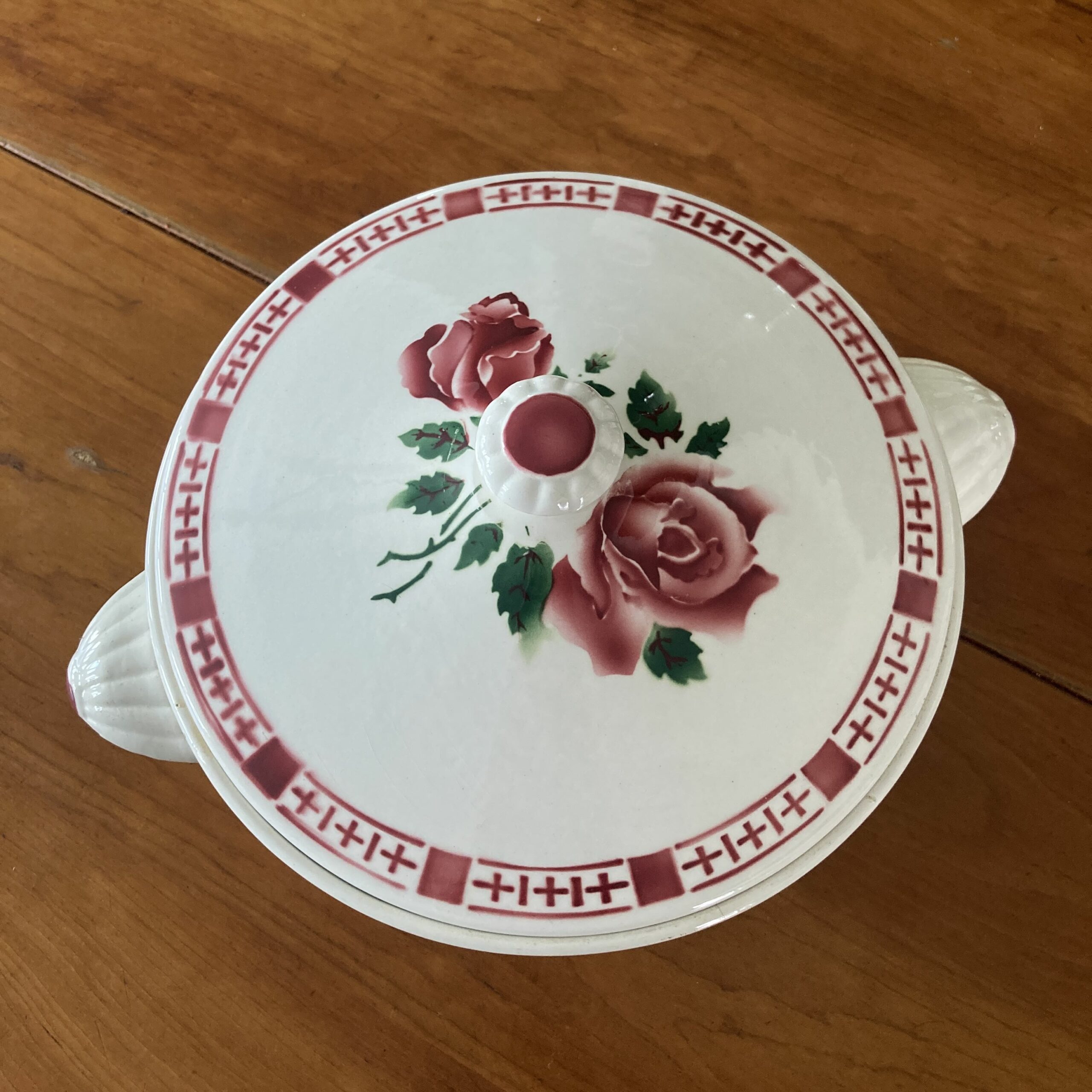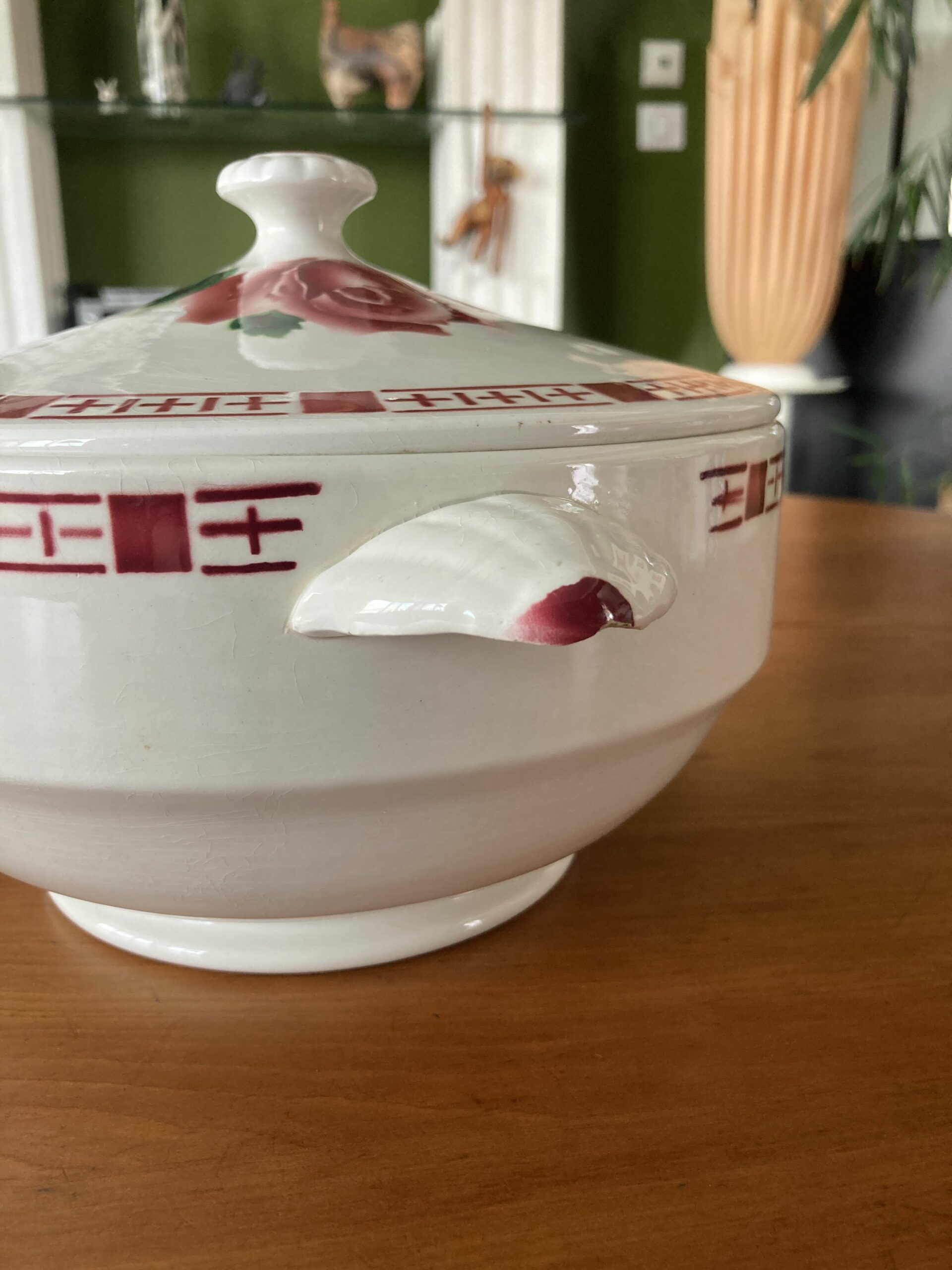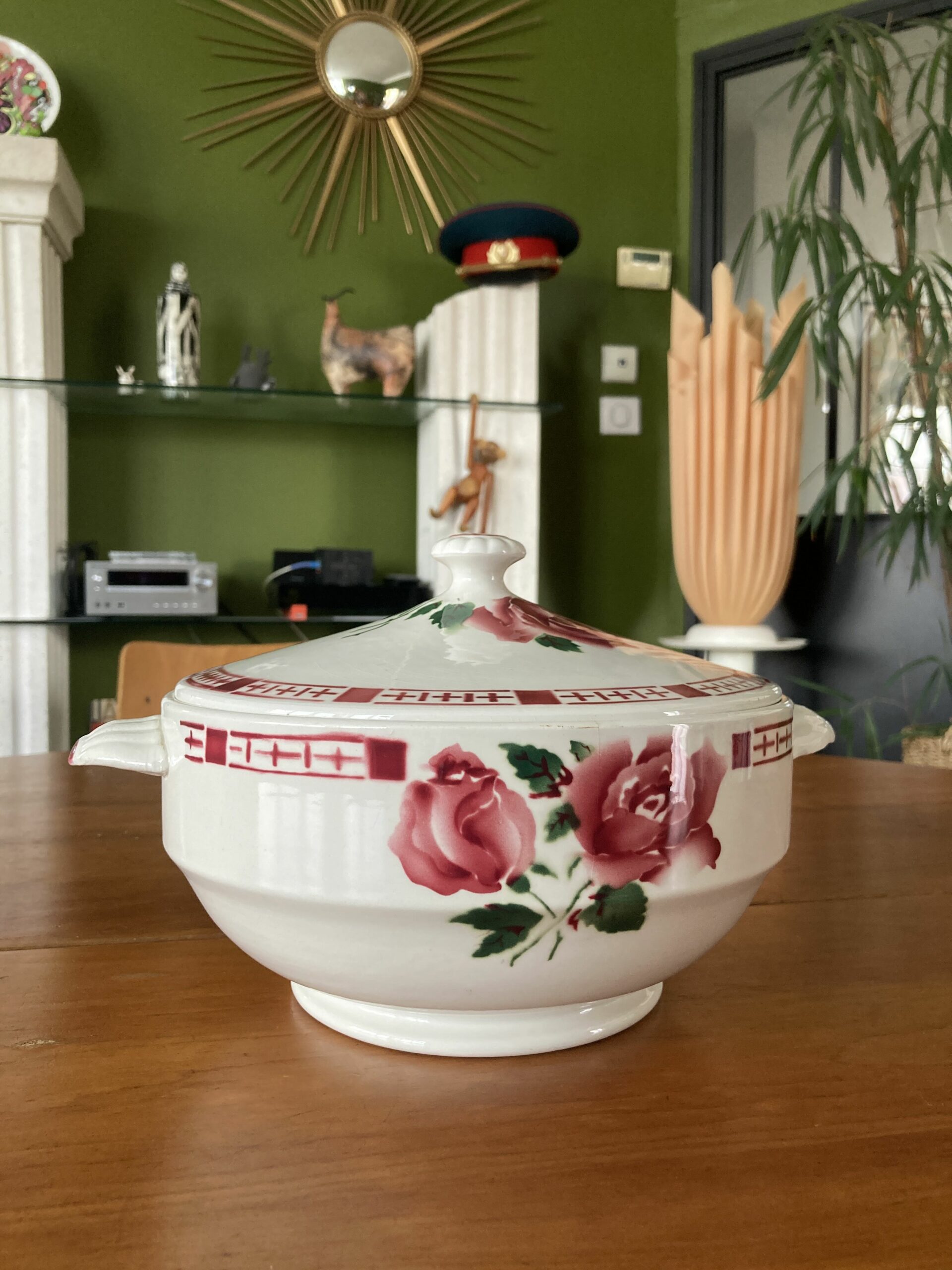 Soupière ancienne Digoin Sarreguemines, modèle Saverne, dans les tons de rose. Roses au centre et tour avec des motifs décoratifs géométriques. Très joli modèle qui peut servir de saladier et de soupière bien sûr !