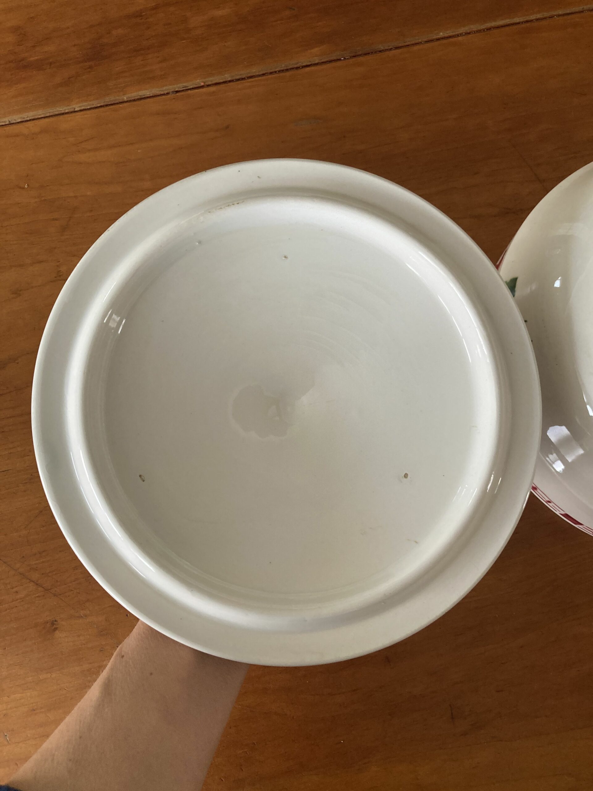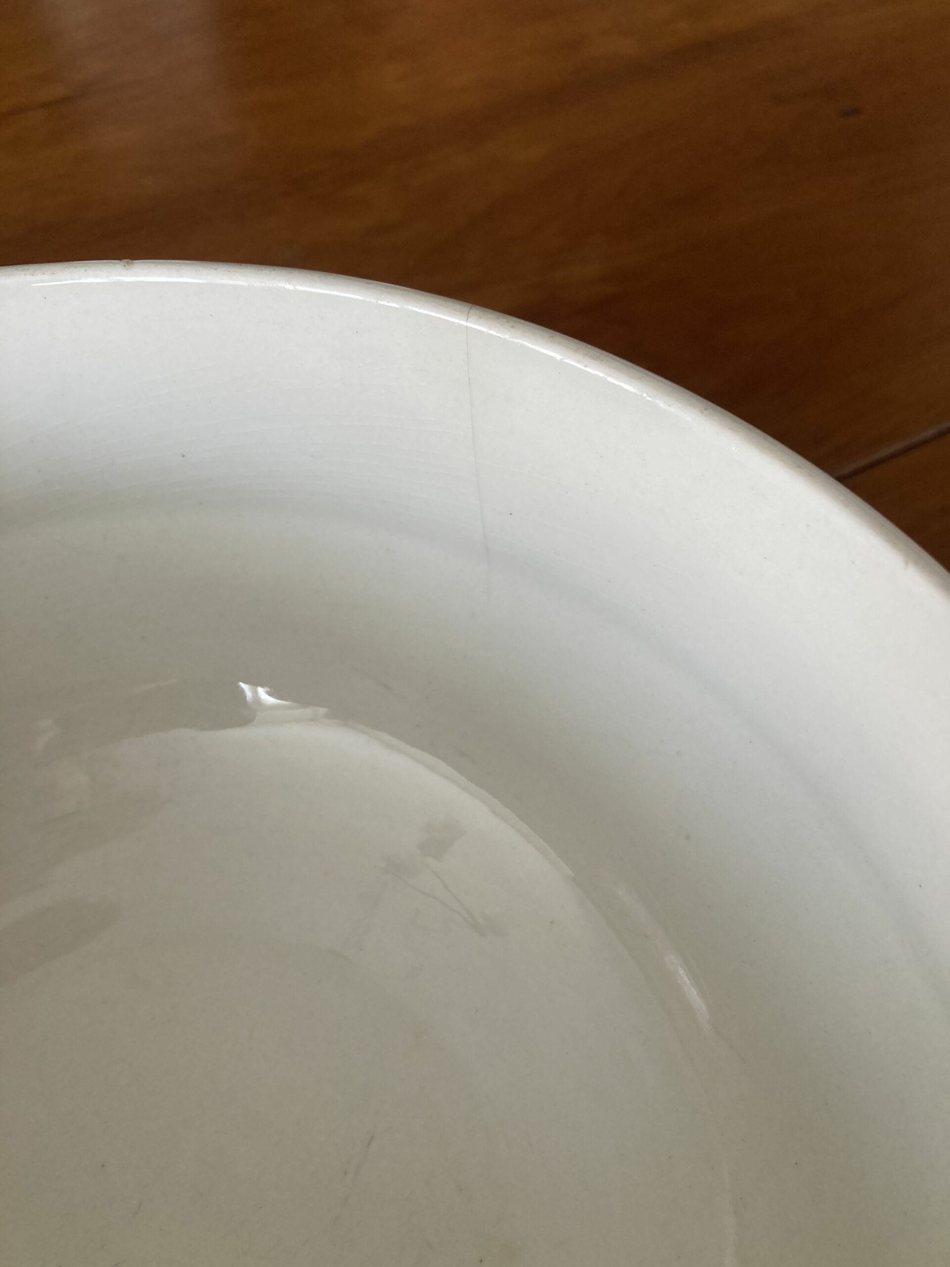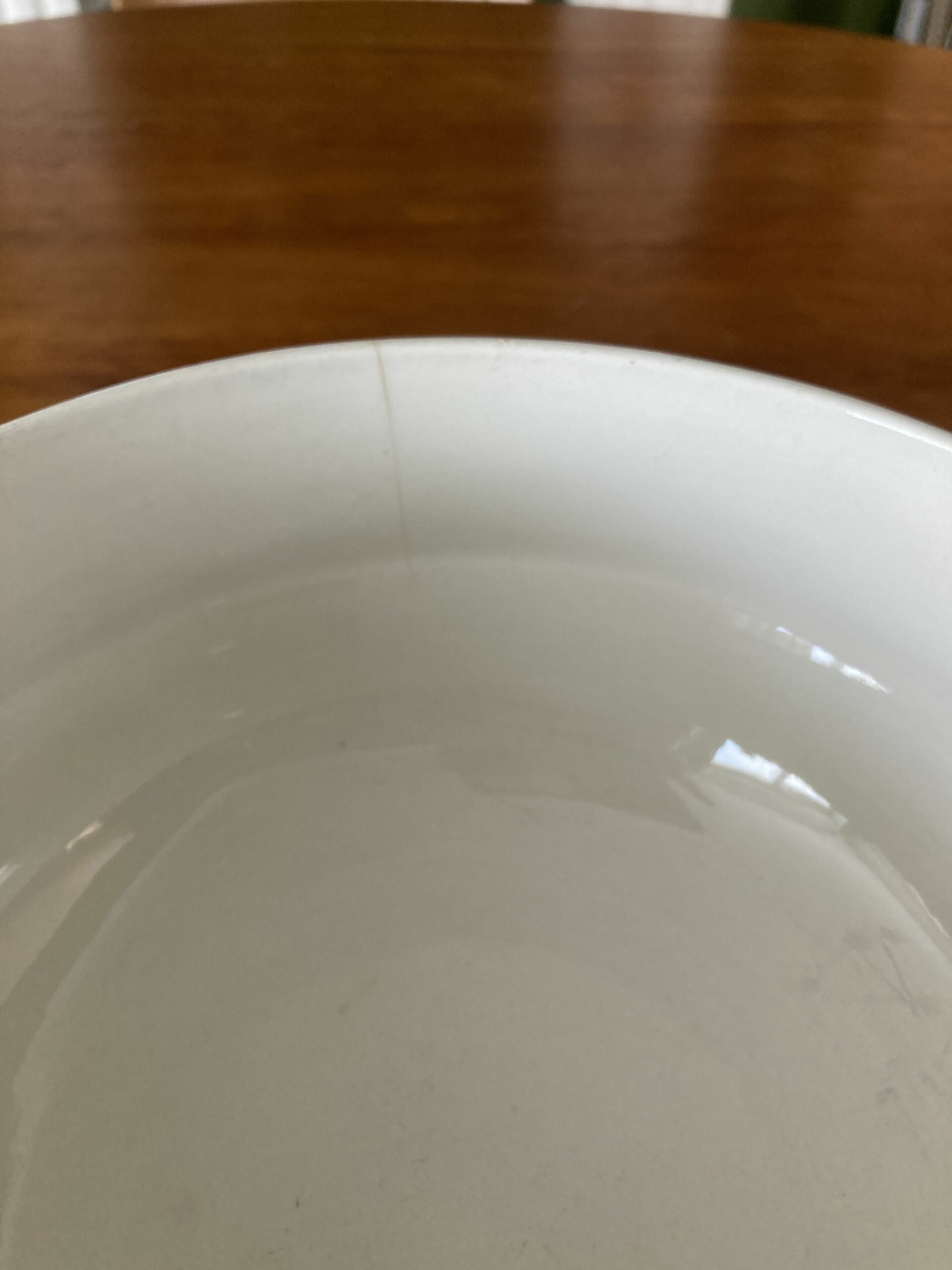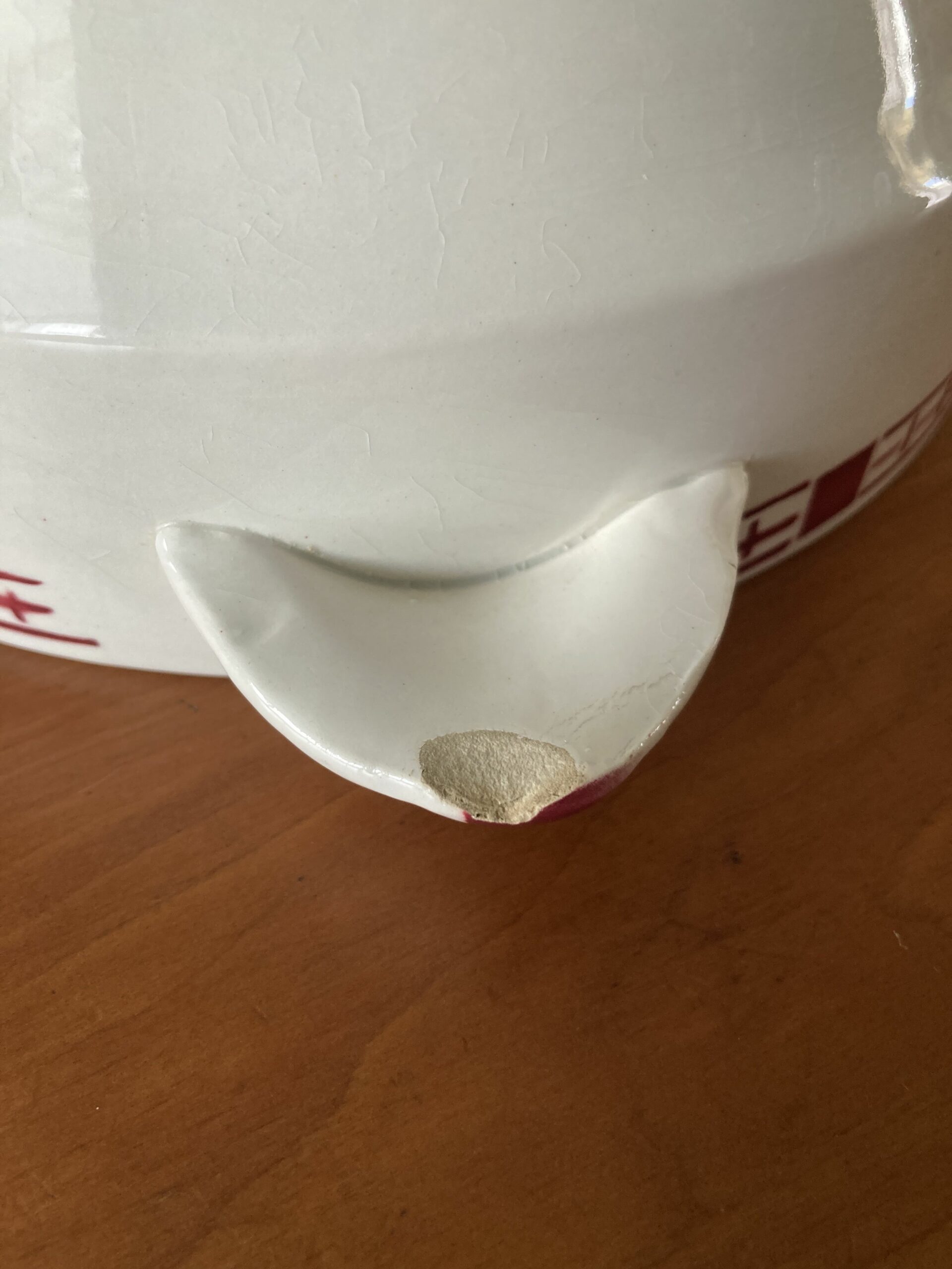 Anses latérales (dont une est ébréchée en dessous (ne se voit pas). Deux fêles diamétralement opposées dans le saladier. Couvercle en parfait état.